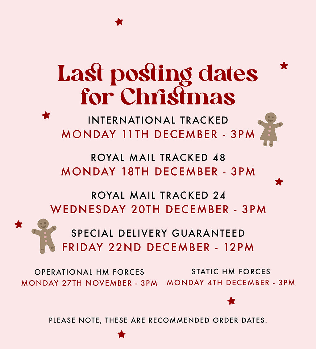 You can still place orders throughout the festive period, these orders will be dispatched on the dates listed above.