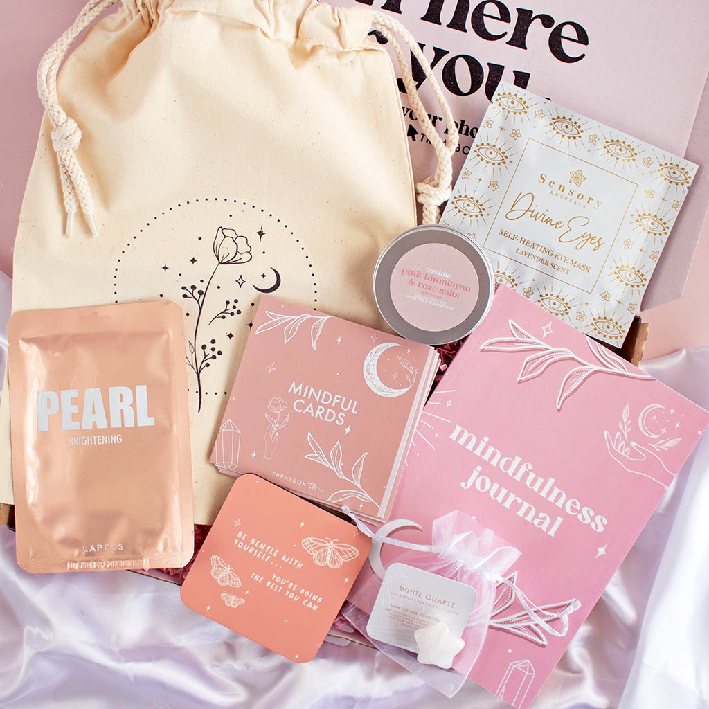 Why not build your own Christmas box for your loved ones? Give the gift of wellbeing with a selection of our self-care-inspired gifts, such as a gorgeous journal, a personalised candle, some bath salts, crystal and an eye mask.