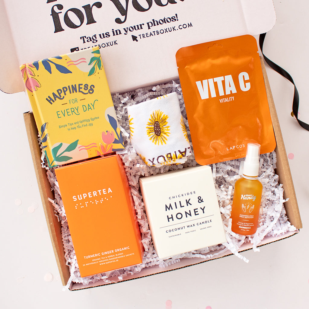 If there was ever a box that screamed fire sign, it’s our Joyful Moments Ready To Go TreatBox. The zesty aesthetic in this one is just *chefs kiss*. With turmeric and ginger Supertea, energising hand spray, a milk and honey candle, a Happiness For Every Day book, an uplifting Vitamin C facemask and sunny sunflower socks - this one is guaranteed to put a smile on their face!