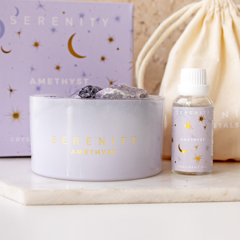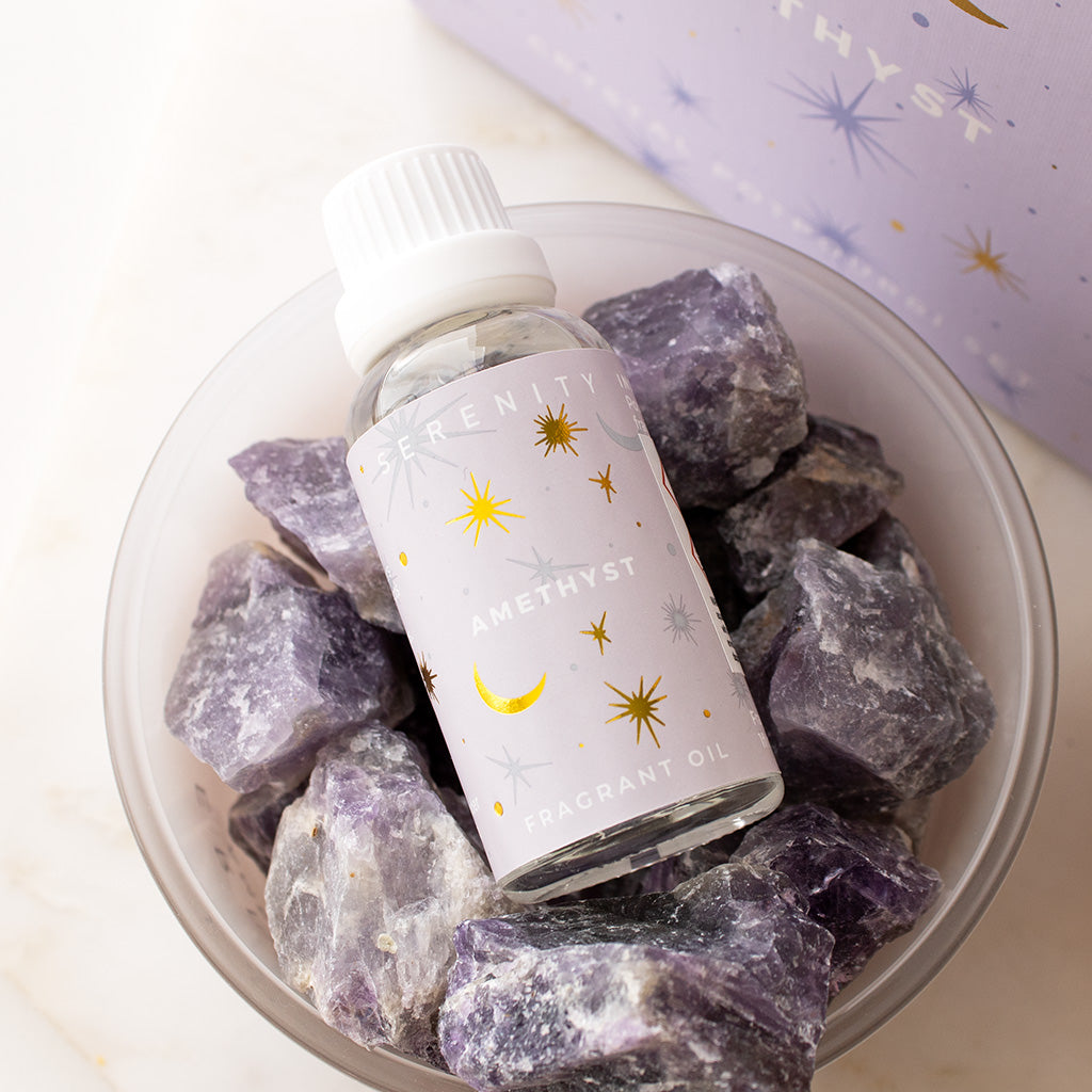 This crystal is known for its spirituality and is believed to bring calmness, peace and inspire. Its fragrance opens with fresh citrus notes of orange, herbal lavender and chamomile.