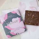 Chocolate topped with flower petals and rose crystals. The smooth and snappy chocolate has geraniums, roses and cornflowers on top of it along with birch sugar. Dairy-free, gluten-free and soy-free.