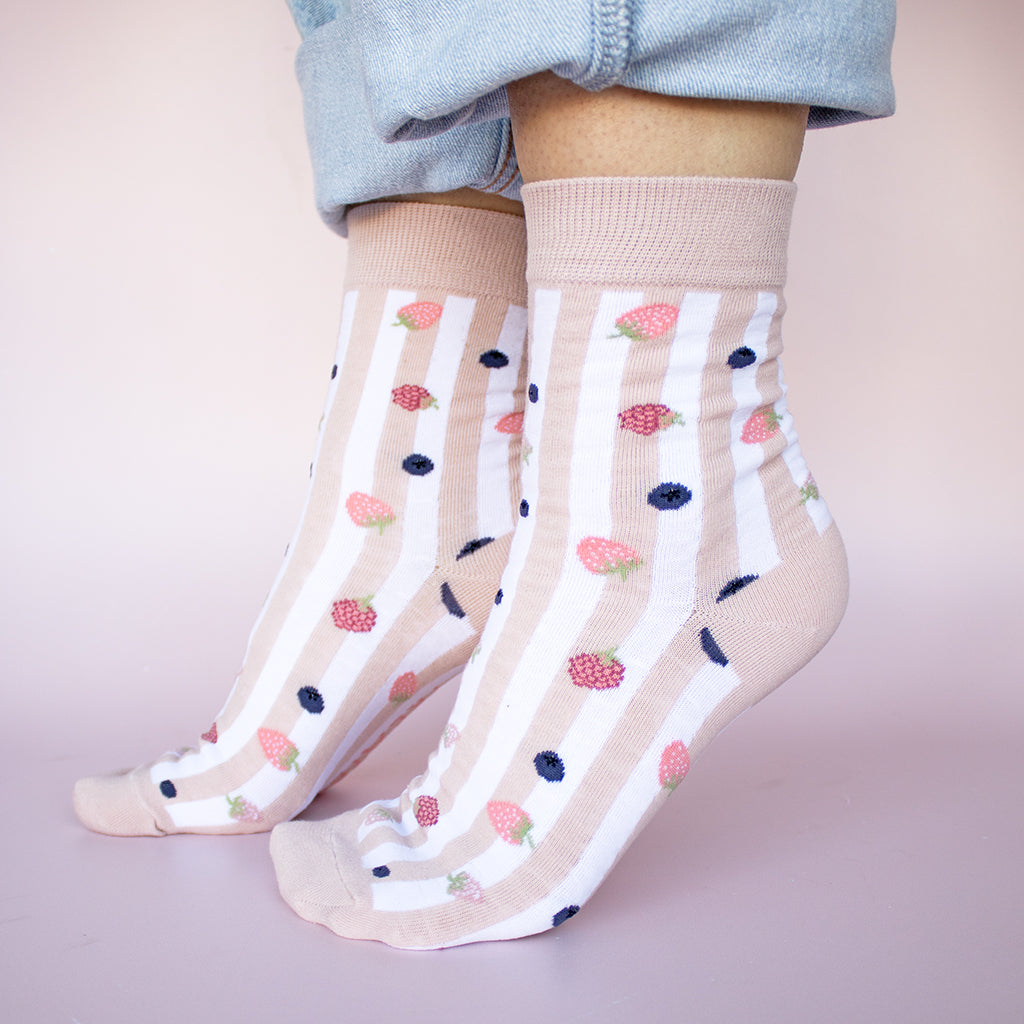 Step into something sweet with these striped berry socks! Whether you're lounging at home or out and about, these cheerful socks add a splash of colour and a hint of fruity fun to your everyday look.