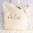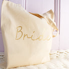 A chic and elegant bride tote bag featuring stunning gold lettering, perfect for carrying all your wedding day essentials in style. Ideal for the bride to be, it combines functionality with a touch of luxury.Size 25cm x 30cm