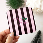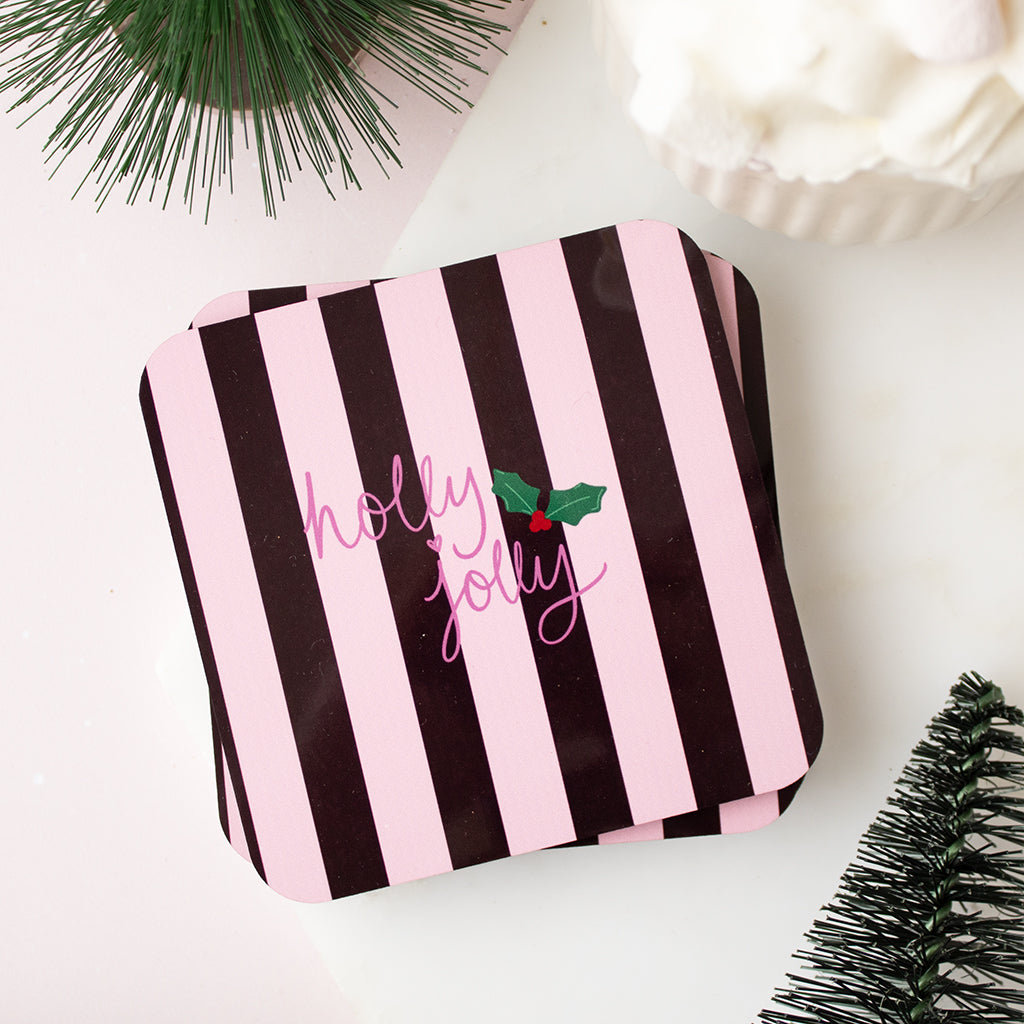Festive striped Christmas coaster featuring the cheerful phrase “Holly Jolly”, perfect for adding a touch of seasonal charm to your holiday table