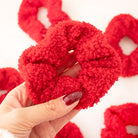 A cosy festive red teddy scrunchie made from soft, plush fabric. Gentle on the hair and perfect for adding a warm, stylish touch to any look.