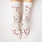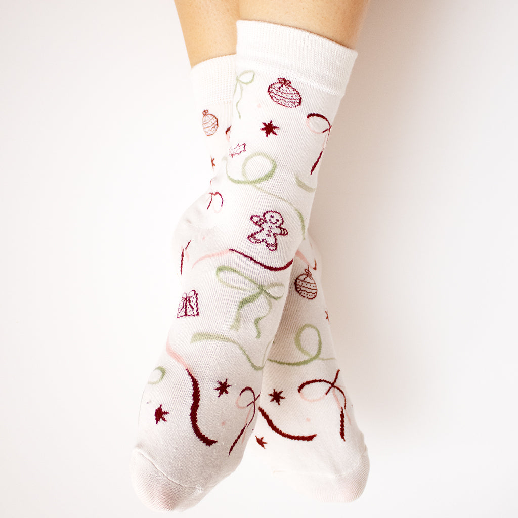 Festive Christmas socks decorated with ribbons and charming holiday details, perfect for adding a cosy and cheerful touch to your festive season.