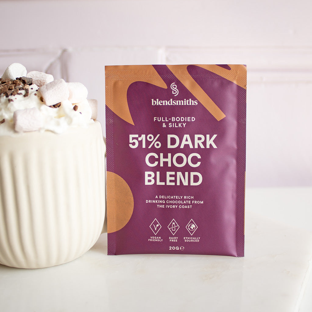 Dark Chocolate Blend boasts delicate sweetness, accompanied by natural bitterness, delivering a rich body of a silky-smooth chocolate. Colour may vary.