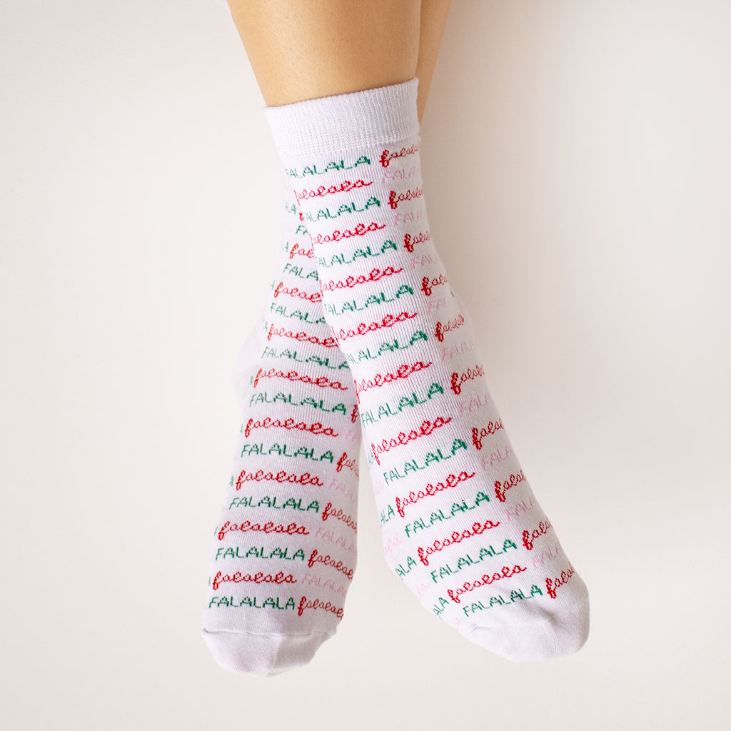 Festive Christmas socks featuring the playful phrase “Fa La La La La” repeated all over, perfect for adding fun and cheer to your holiday wardrobe.