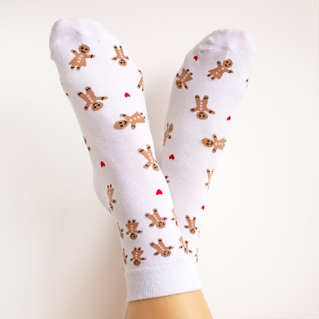 Soft white socks featuring charming gingerbread designs, perfect for adding a cosy and festive touch to your Christmas wardrobe.