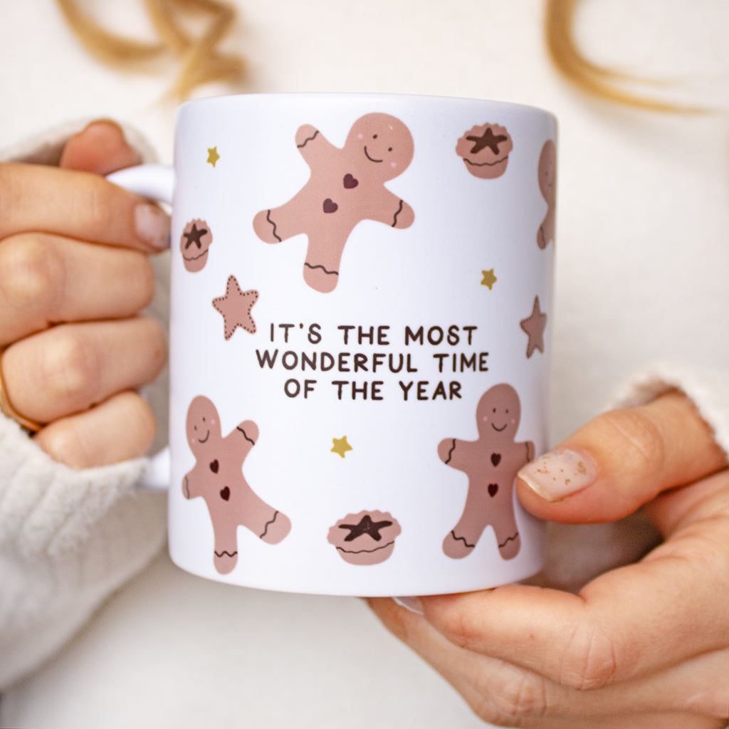 Festive matte mug featuring the phrase “Most Wonderful Time of the Year” and decorated with charming gingerbread designs, perfect for enjoying cosy Christmas drinks in style. With an 11oz capacity, it's both microwave and dishwasher safe for everyday convenience. Please note: colours may vary slightly due to screen settings.
