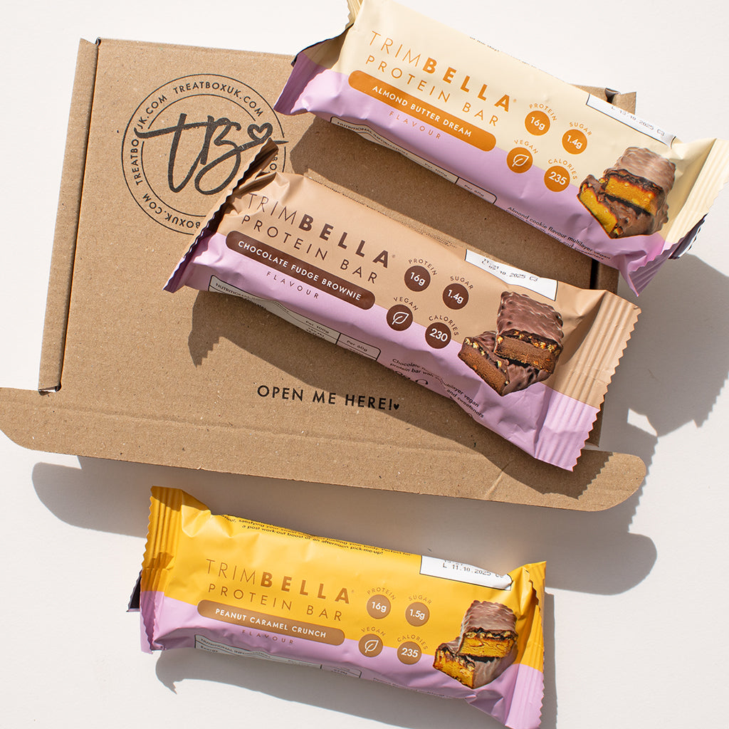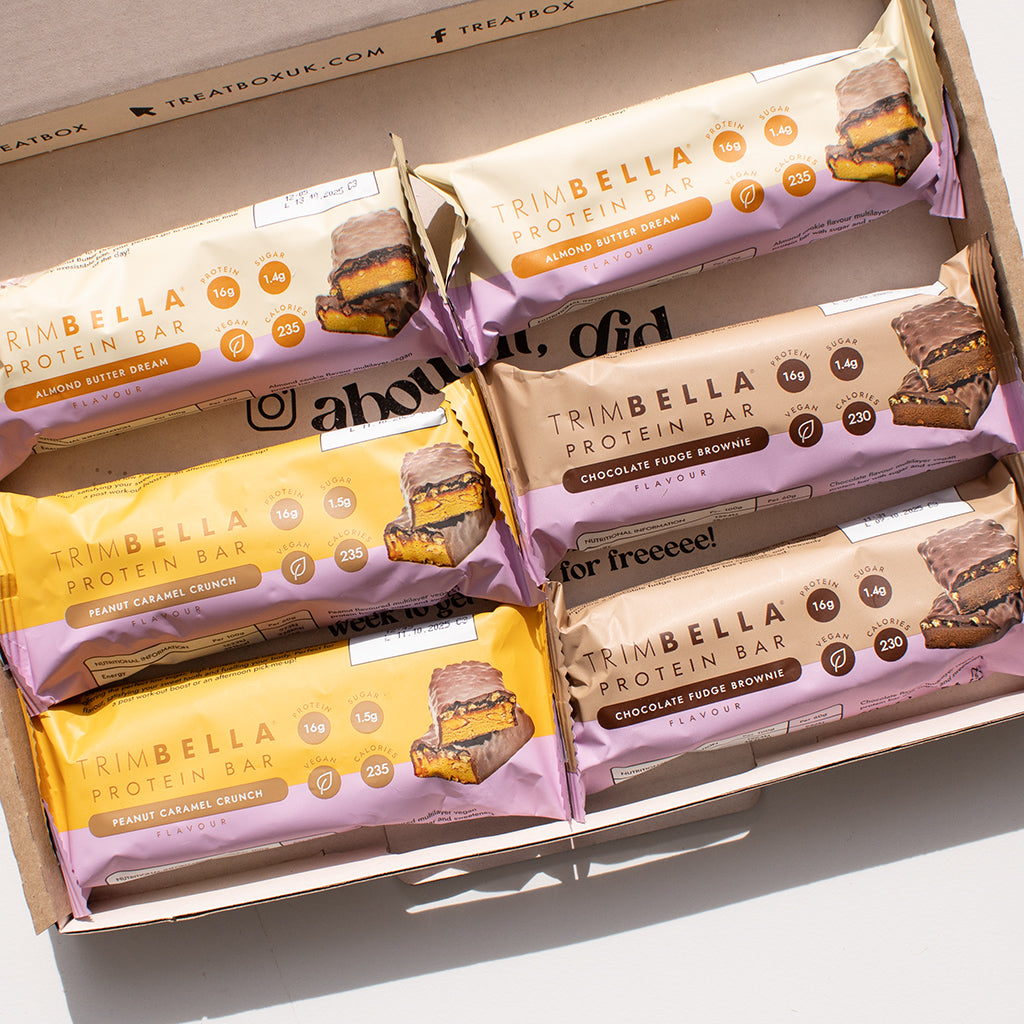 Included in this box is 3 OR 6 Trimbella Bars of the following flavours: Chocolate Fudge Brownie Peanut Caramel Crunch Almond Butter Dream The Best Before dates range from 09/10 - 13/10 but still are yummy for consumption!