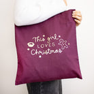 Stylish Christmas tote bag featuring “This Girl Loves Christmas” in sparkling gold metallic lettering, ideal for carrying your festive essentials with a touch of holiday cheer. Size 25cm x 30cm