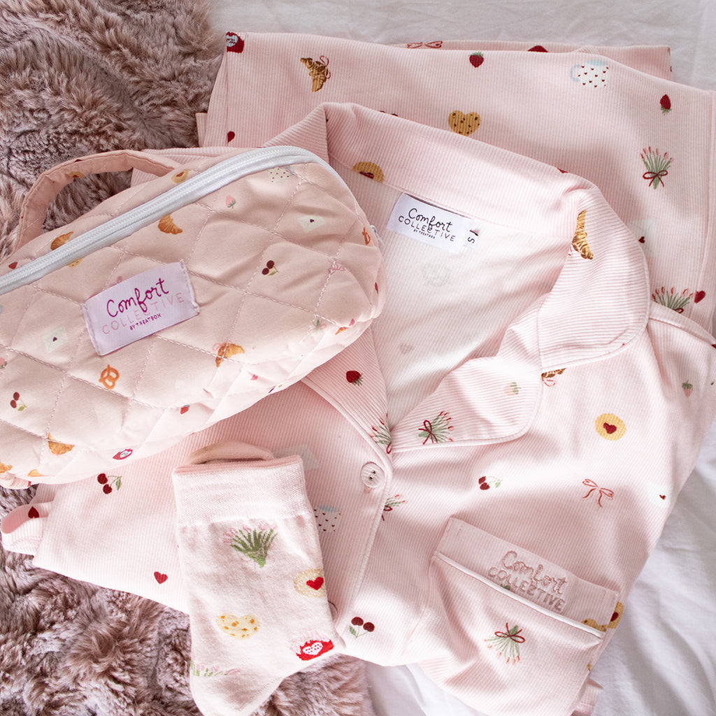 This box from our Breakfast in Bed Edit brings together cosy comfort featuring our new pastry print pyjamas, matching socks, and lay-it-all-out makeup bag. Thoughtfully designed by us, this set is perfect for slow mornings, relaxed evenings, and a little everyday indulgence.