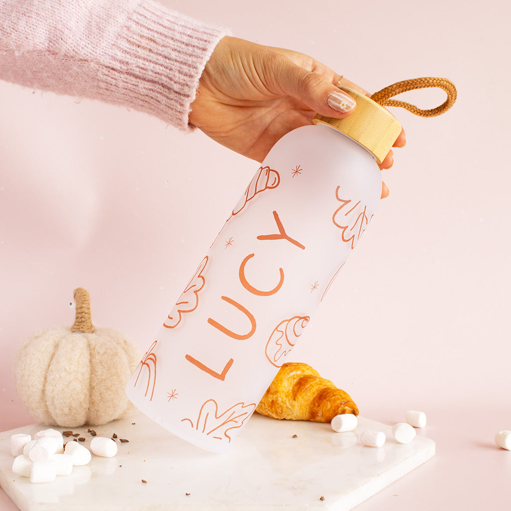 Stay hydrated in style with our frosted glass water bottle, showcasing a stunning autumn-inspired print and a natural bamboo lid. Ideal for autumn walks, workouts, or everyday use - bringing a seasonal touch wherever you go.