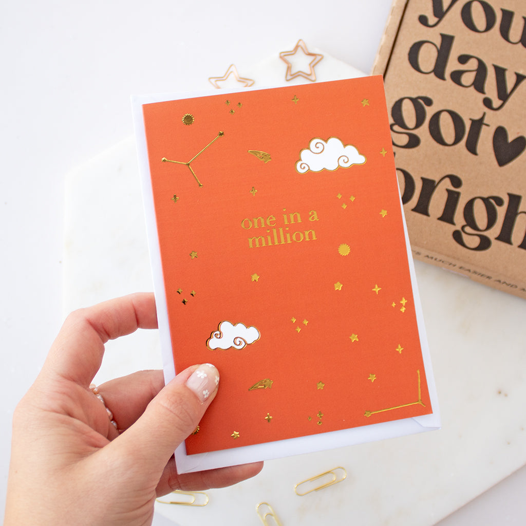Let someone know just how much they mean to you with this 'One in A Million' card. It features a gorgeous starry design and shimmery gold foil that adds a luxurious touch. An easy and thoughtful way to show you care.