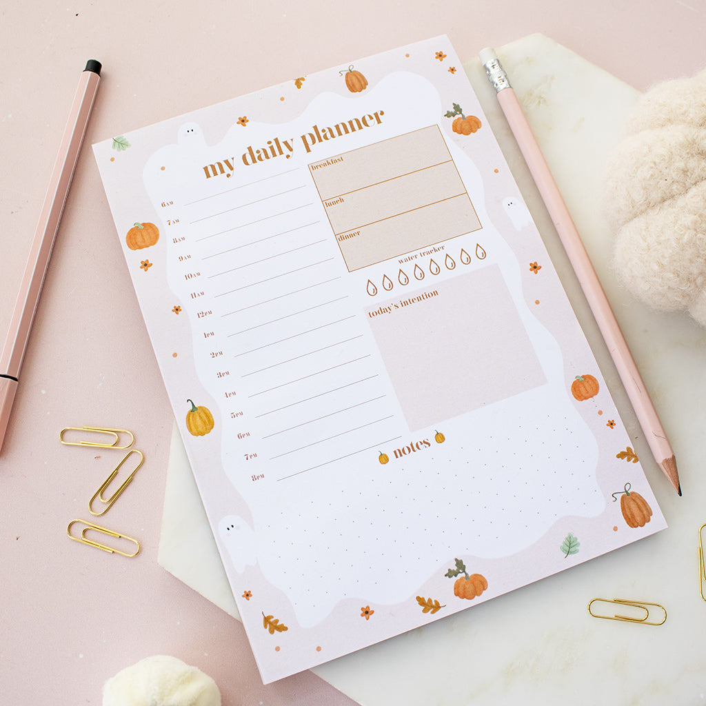 A daily planner to keep you organised in seasonal autumn style. With cute pumpkins and little ghosts, this daily planner keeps your notes, lists, and plans in one place - while adding a touch of autumn magic to your desk.