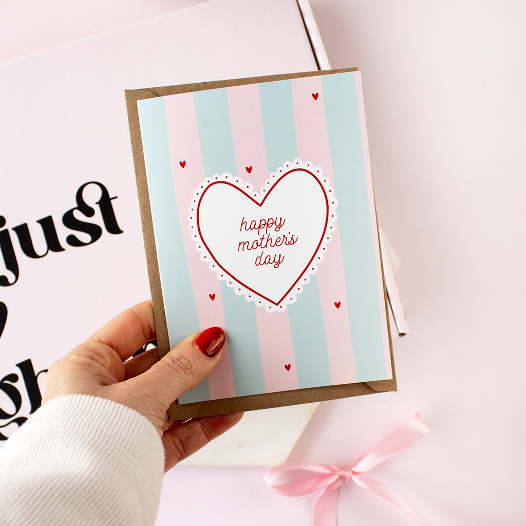A cheerful A6 card featuring blue and pink stripes with a “Happy Mother’s Day” message, perfect for sending warm wishes and celebrating mums in a bright, stylish way.