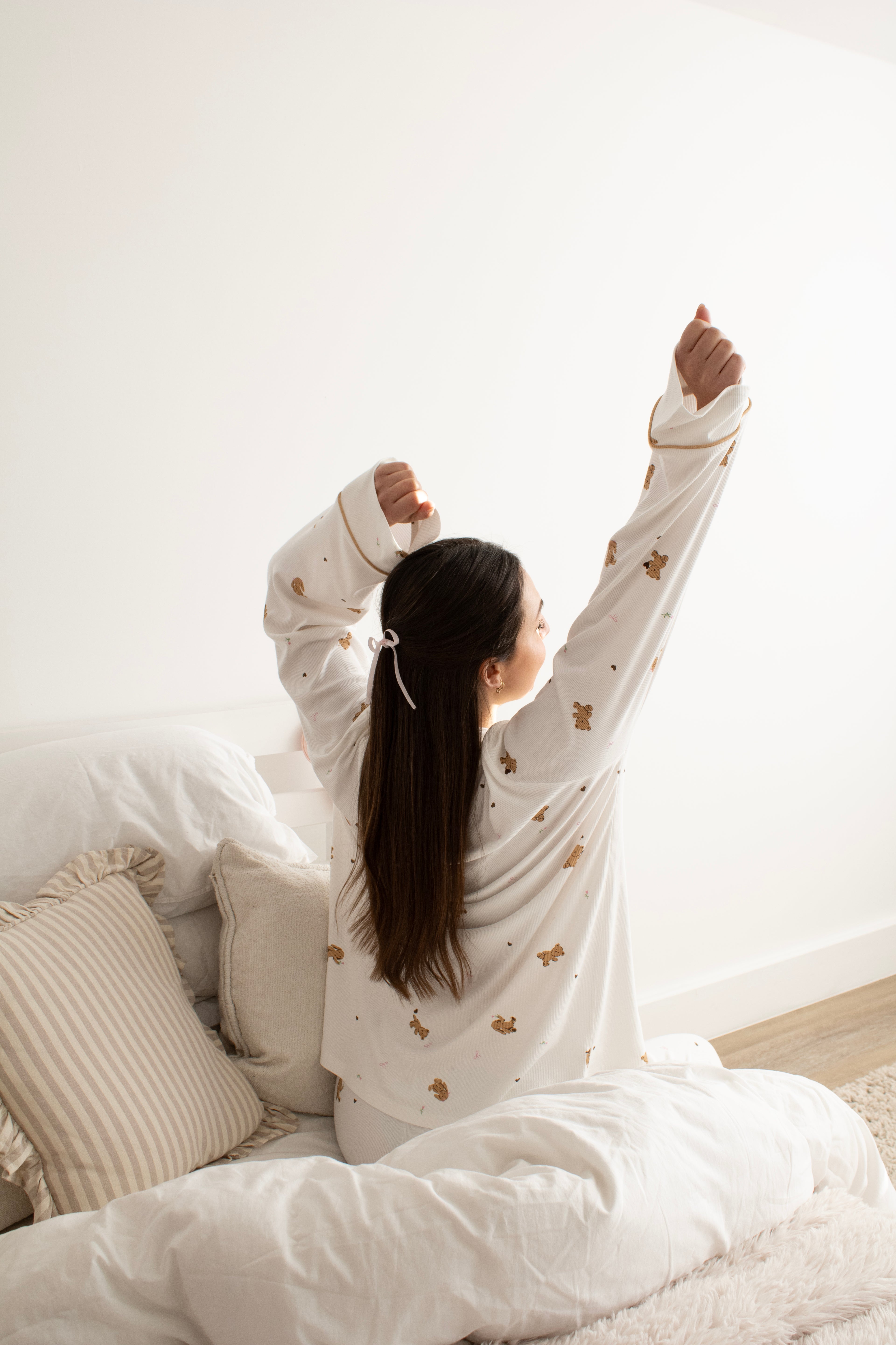 Please note that these pyjamas are designed with an oversized fit. We recommend selecting a size down for a more fitted feel. Wrap yourself in comfort with our Bear & Bunnies pyjamas, crafted from soft ribbed cotton with a flattering stretch and a playful print. Perfect for relaxed evenings and lazy mornings.