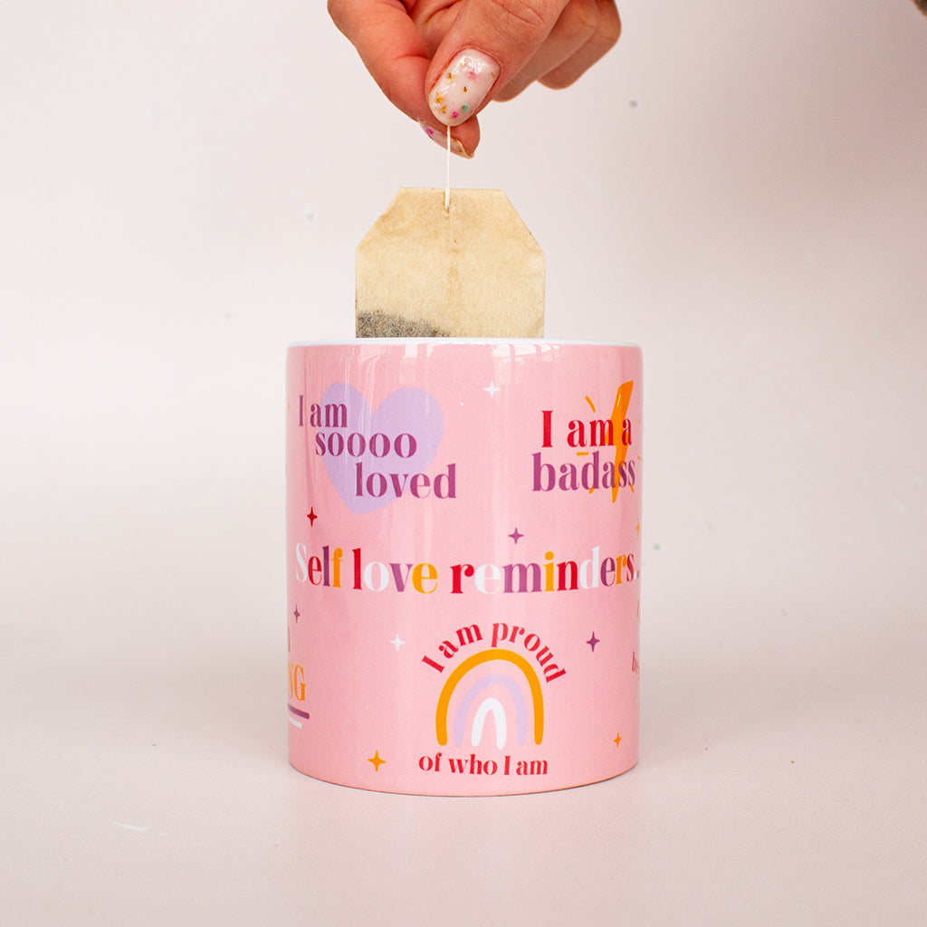 Self-love reminders mug reads "Self Love reminders" on the front of the mug and then all the way around the mug features different positive affirmations and illustrations from the front to the back of how amazing you are!