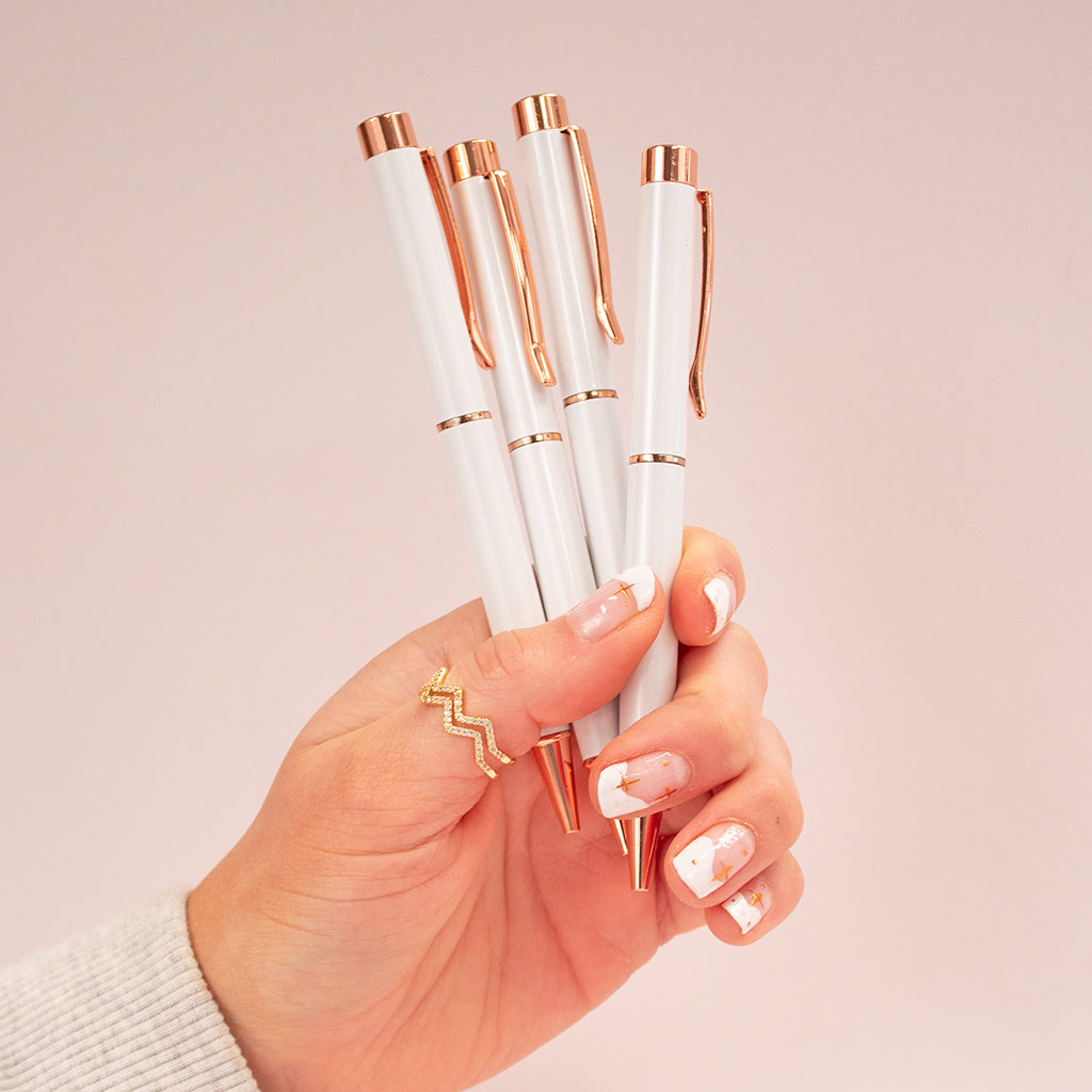 - Rose Gold White Pen - A sleek pen to pair perfectly with the stationery pieces.