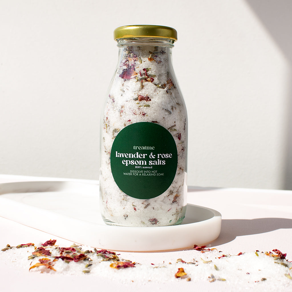 A Bottle of Epsom Bath Salts with Lavender & Rose to cleanse and nourish the skin. Close your eyes, and you almost feel like you're back in the spa.