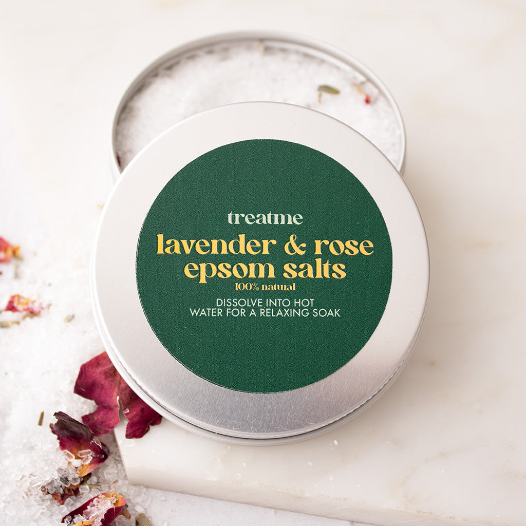 Epsom salts with dried rose petals and lavender to cleanse and nourish the skin, while also adding a relaxing sweet fragrance to your bath.
