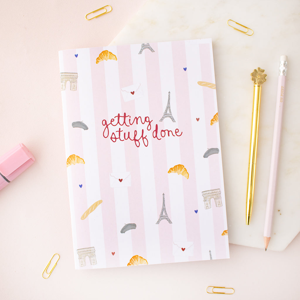 A chic Paris-inspired notebook titled “Getting Stuff Done”, perfect for organising your day with a touch of French flair. Includes 80 pages of plain paper.