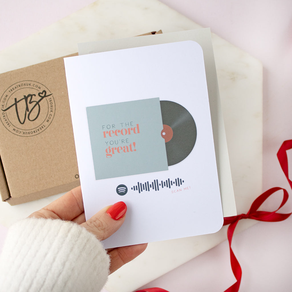 A unique Valentine’s card featuring the phrase “For the record…” with four different ways to complete the message. Each card includes a scannable music code that plays a chosen song, creating a truly personal and meaningful gift. Comes with an envelope.